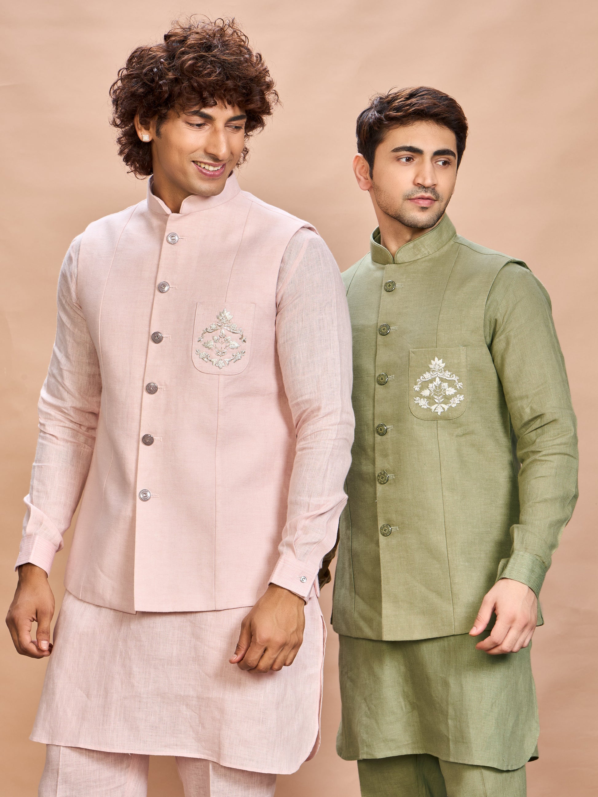 Radiate refined elegance with this Blush Pink Linen Jacket Kurta Set. Tailored in premium linen, this ensemble features a soft blush pink hue, a minimal embroidered Nehru jacket, and a sleek kurta-pant combination — perfect for sangeet evenings and daytime wedding celebrations.
