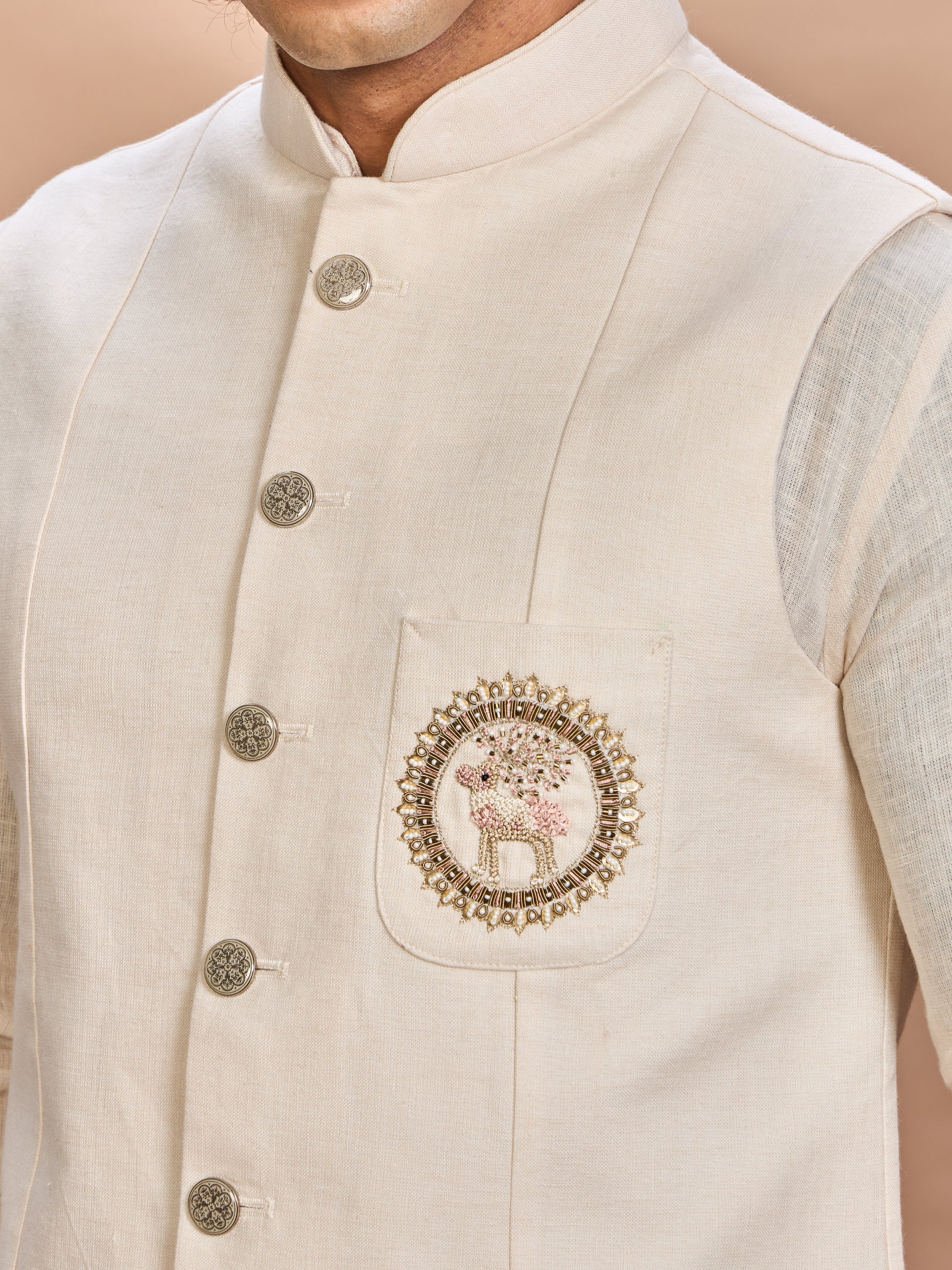 Embrace timeless sophistication with this Cream Linen Jacket Kurta Set. Designed for the modern gentleman, this elegant ensemble blends minimalism with a royal touch — perfect for sangeet, wedding, or festive occasions.