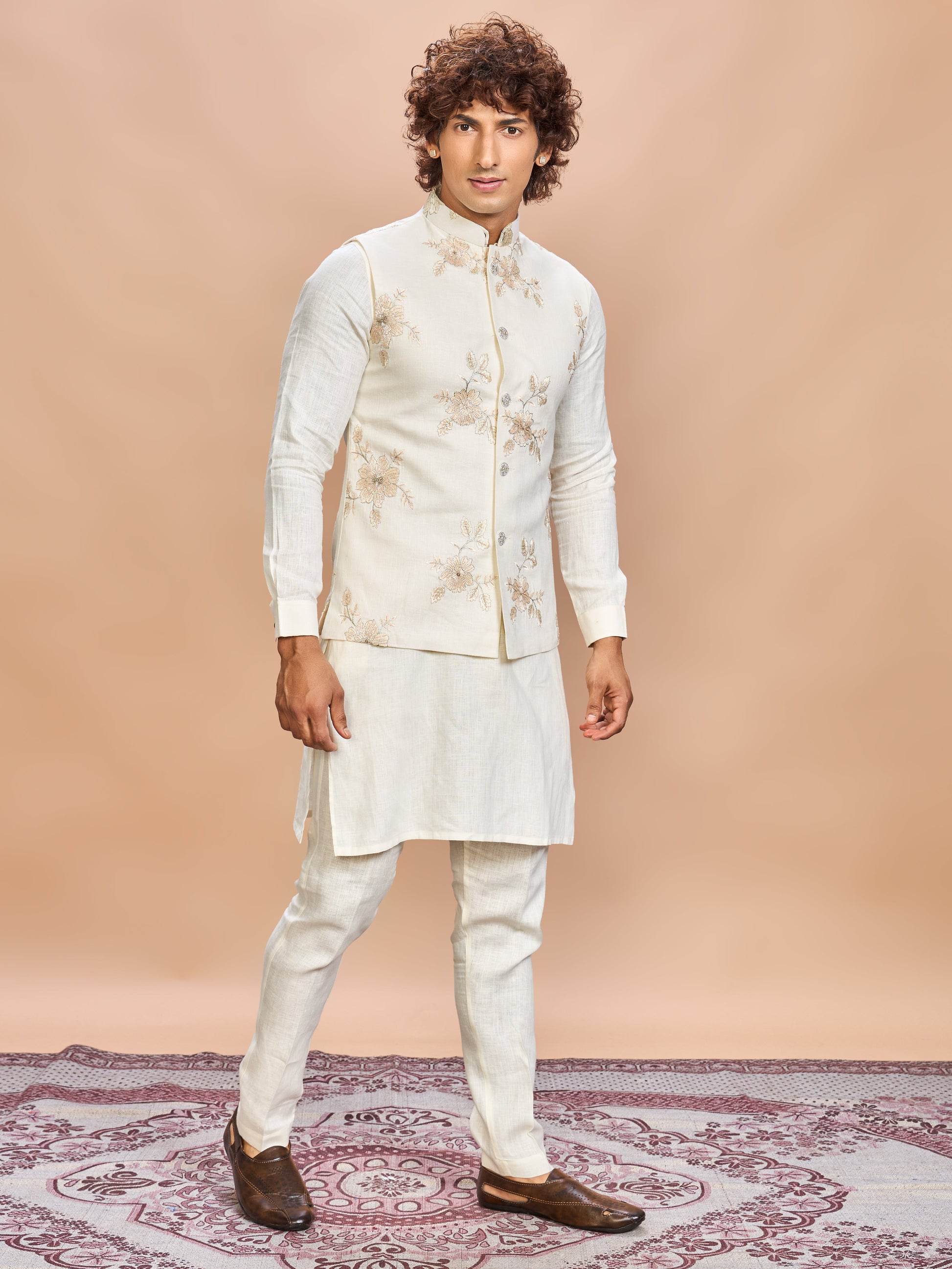 Luxury Cream Embroidered Linen Jacket Kurta Set for Men