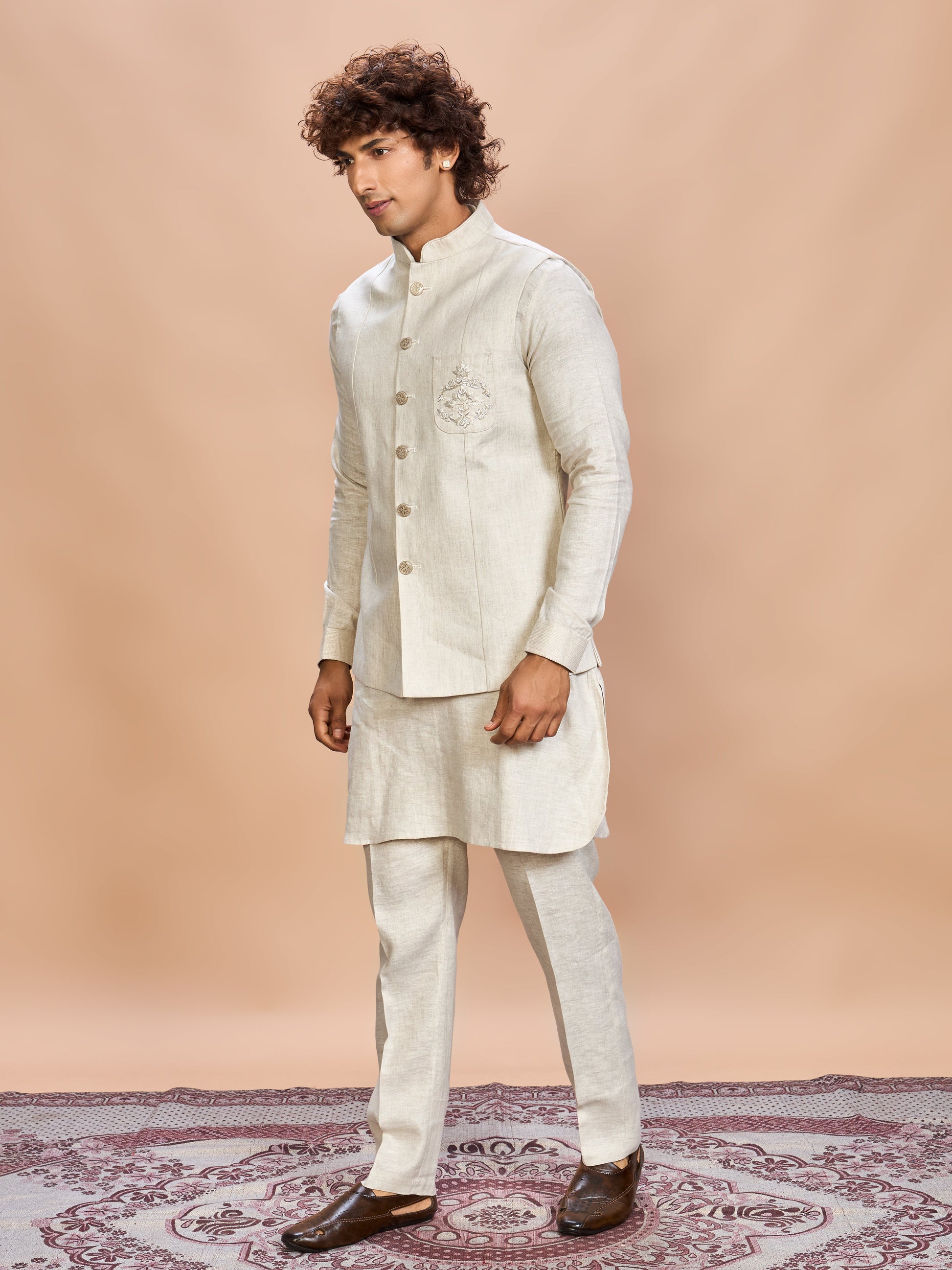 Subtle, sophisticated, and timeless — this natural linen jacket kurta set captures effortless modern elegance.