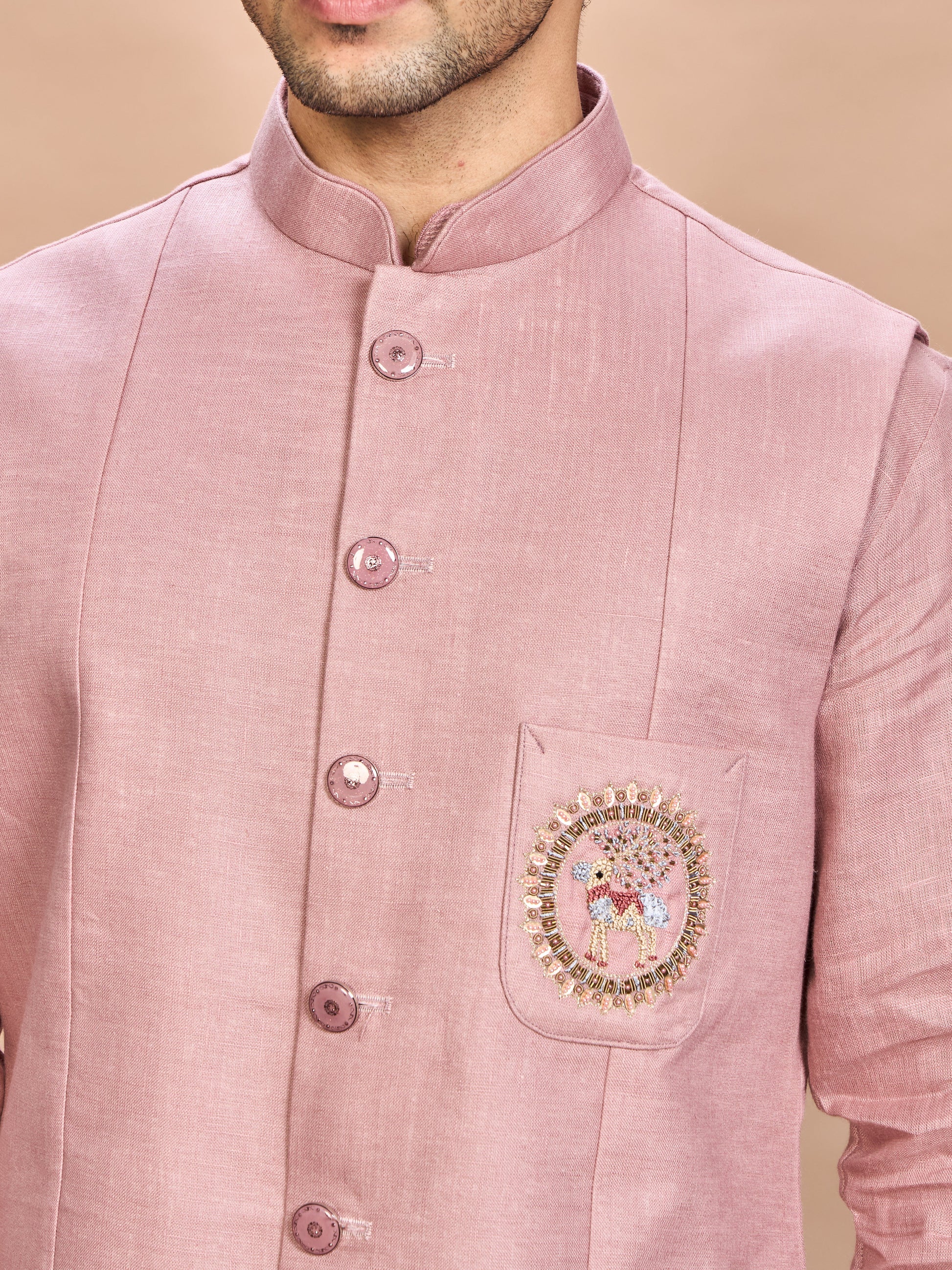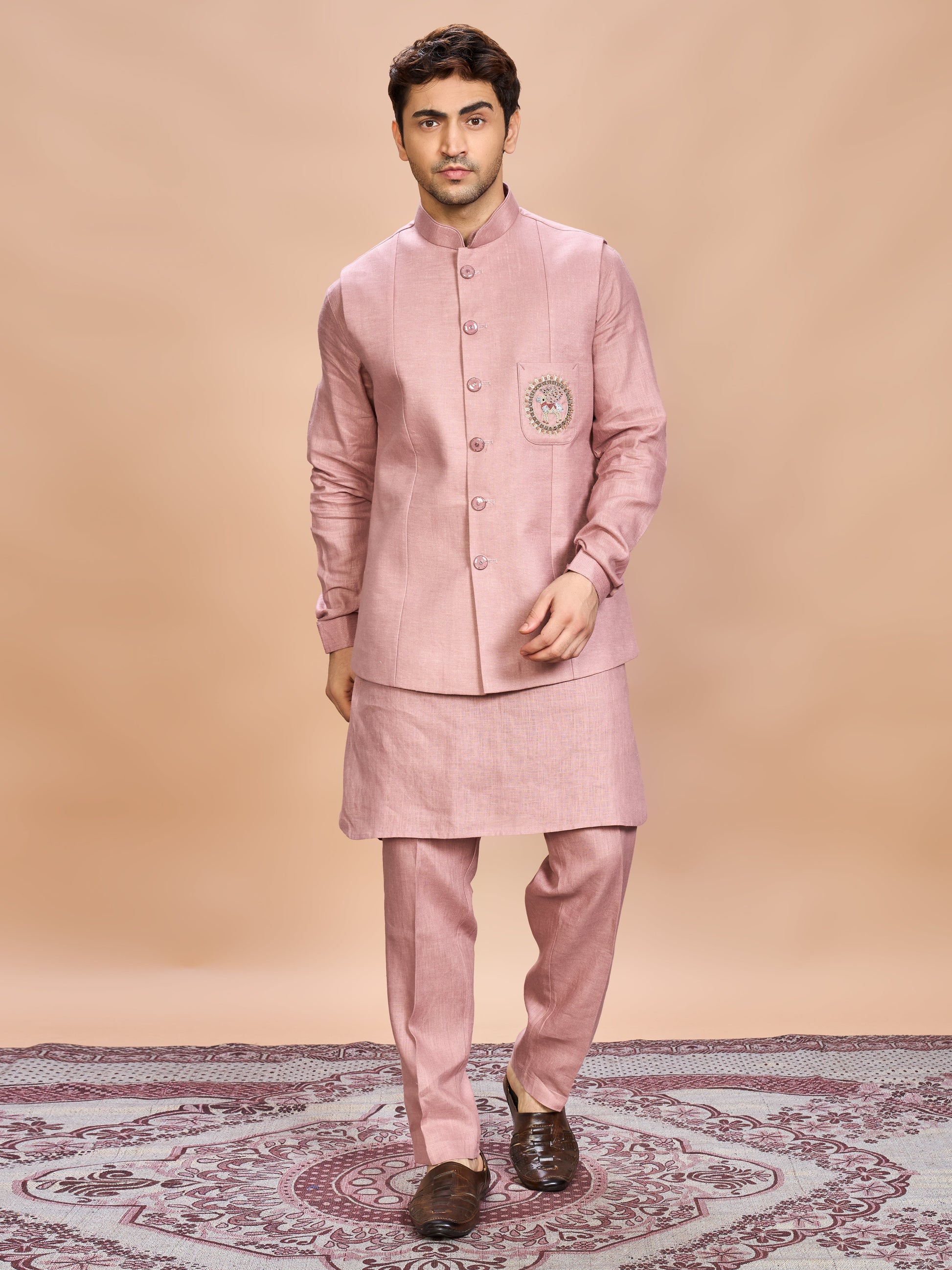 Elevate your ethnic wardrobe with this Pink Linen Jacket Kurta Set. Crafted with finesse and sophistication, this ensemble blends comfort with classic elegance — making it a perfect choice for sangeet, reception, or wedding celebrations.