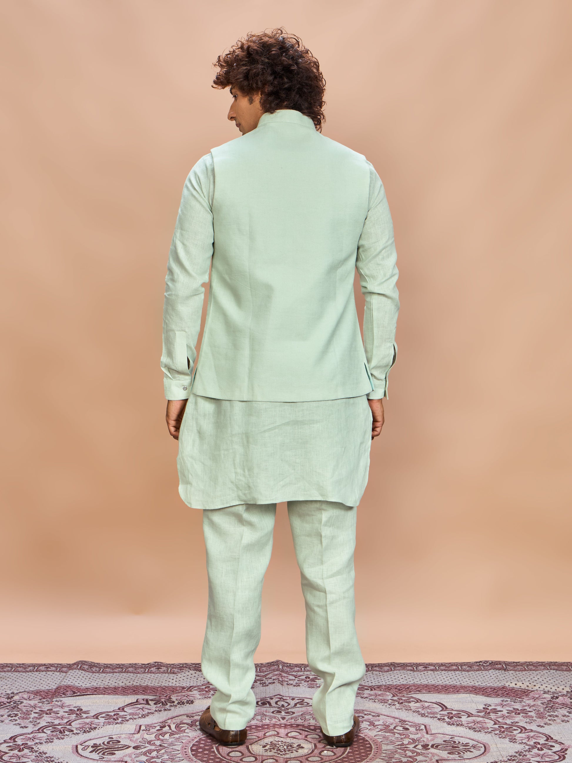 Fresh, graceful, and versatile — this pista linen jacket kurta set defines modern festive sophistication.