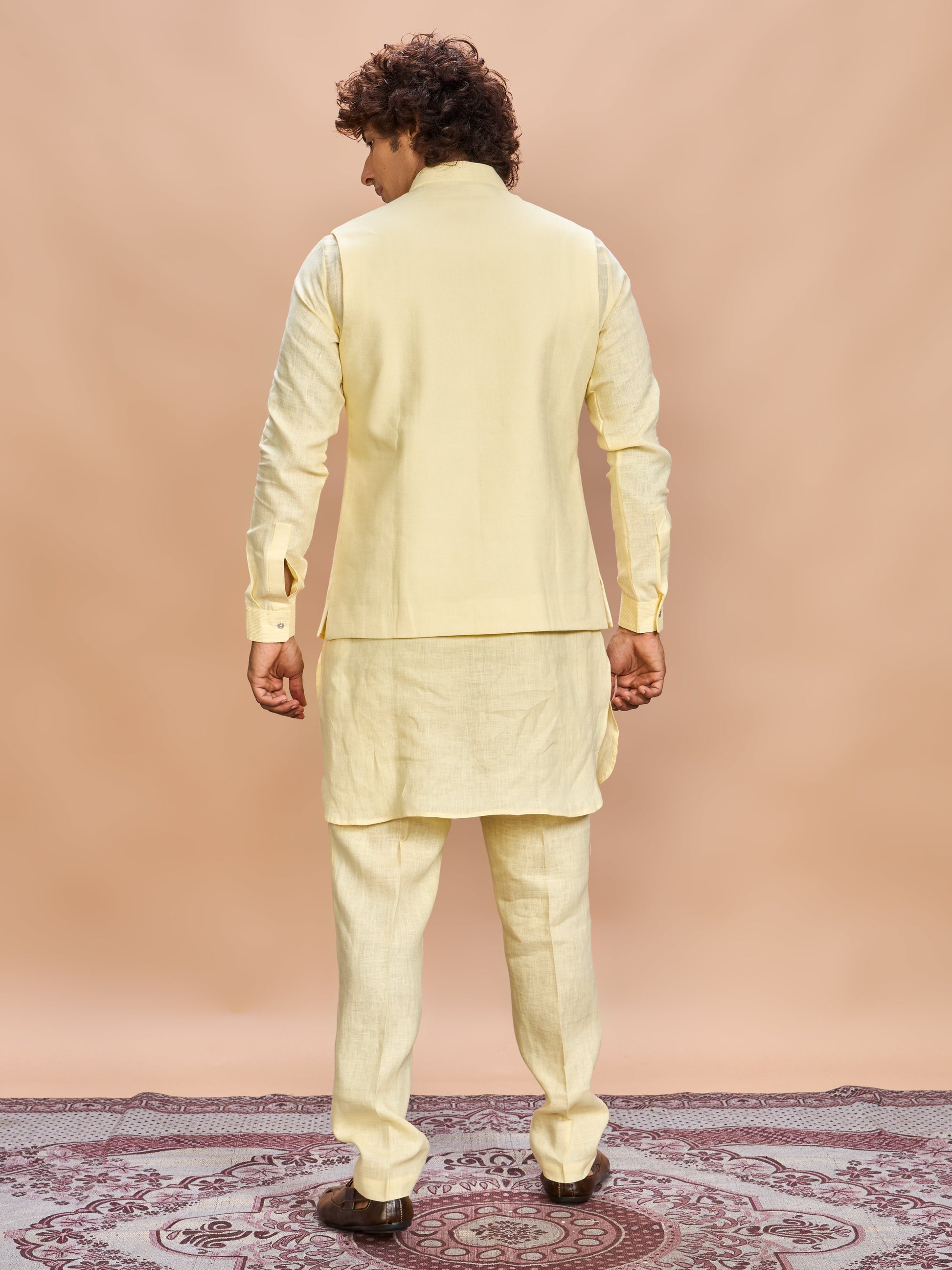 Bright, breezy, and beautifully elegant — this yellow linen kurta set redefines festive sophistication with effortless charm.